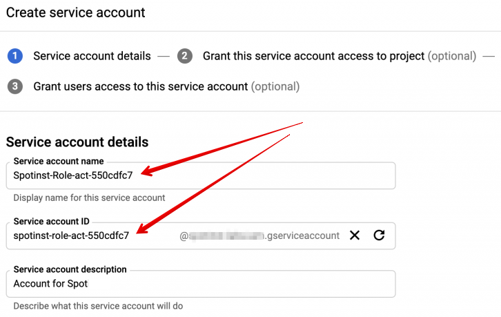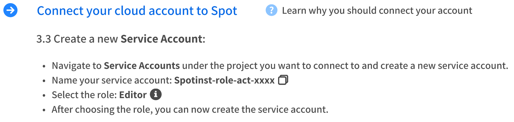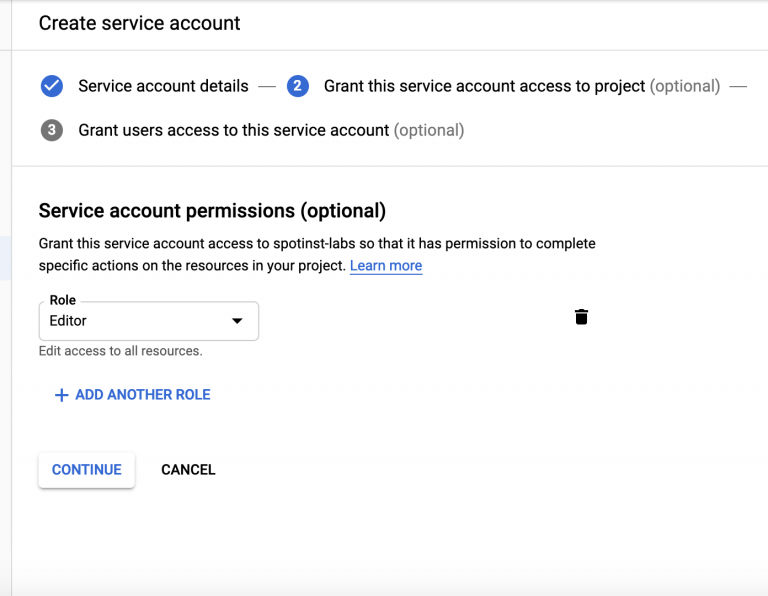 In this step you create a service account that Spot will use to manage resources in your GCP account and assign it the role of Editor. Complete this step in the order of the bullets in the wizard.