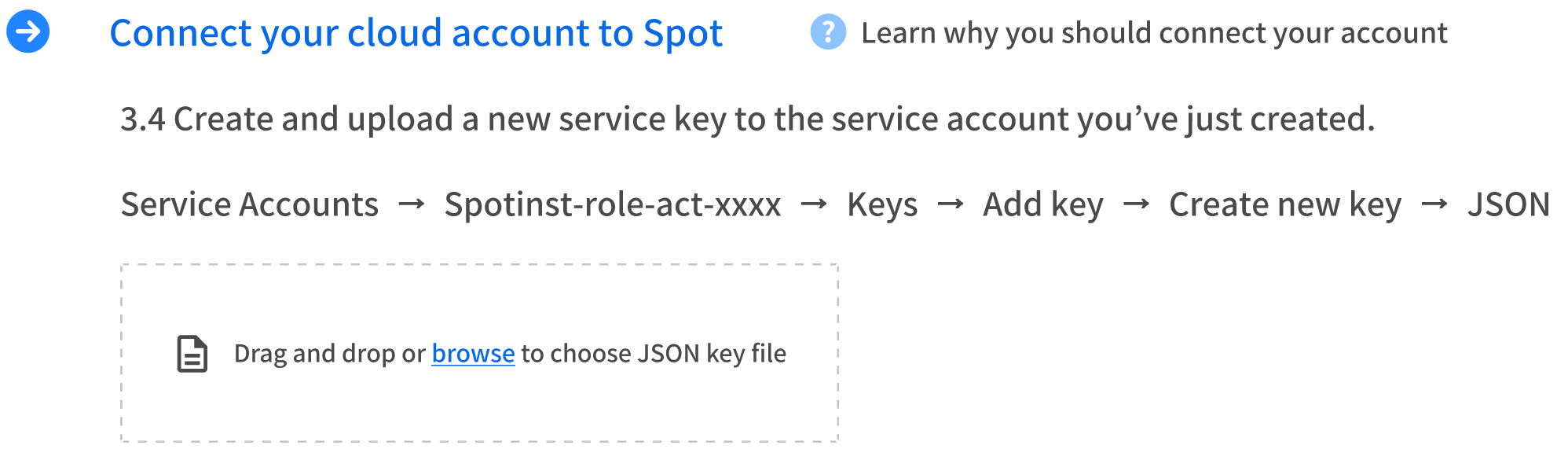 2. Once you have created the key, drag and drop the JSON file to Spot, to the area indicated in the wizard.