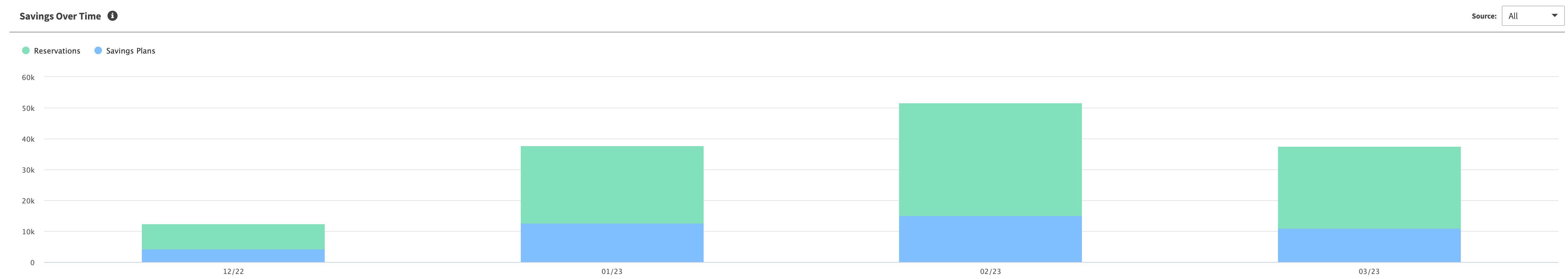 A bar graph showing the amount of savings each month broken down by type of savings. This graph displays the savings from reservations and savings plans. You can use the filters at the top of the page and source filters specific to each graph.