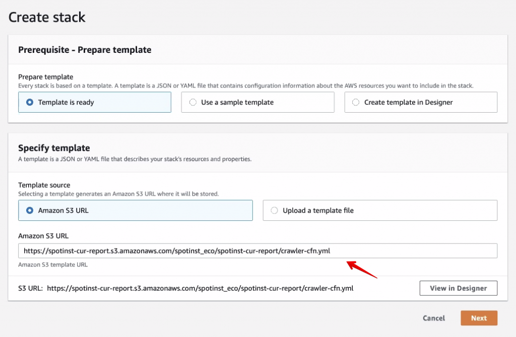 5. Click Create Stack and paste that object URL into the field Amazon S3 URL as shown in the image below.