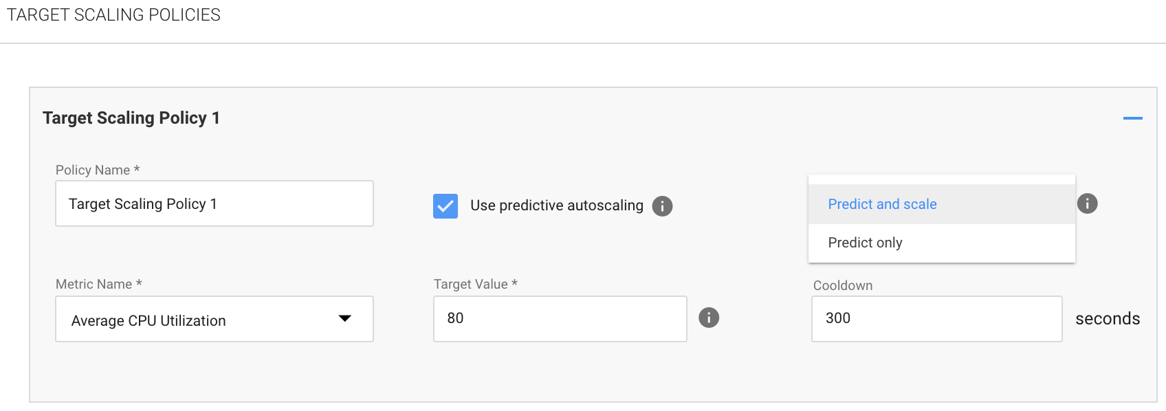 Predictive Autoscaling is configured in a Target Scaling Policy. You can enable it when you create an Elastigroup or by editing an existing Elastigroup. Do the following: