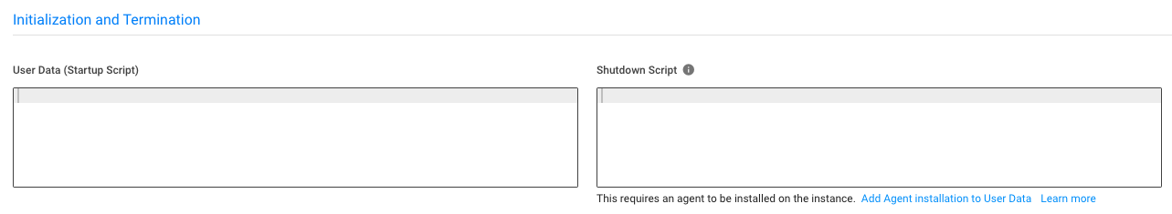 Shutdown Scripts require installing an Agent from the User Data. Click the Add Agent installation to User Data link to automatically add the required bash script to the User Data section.
