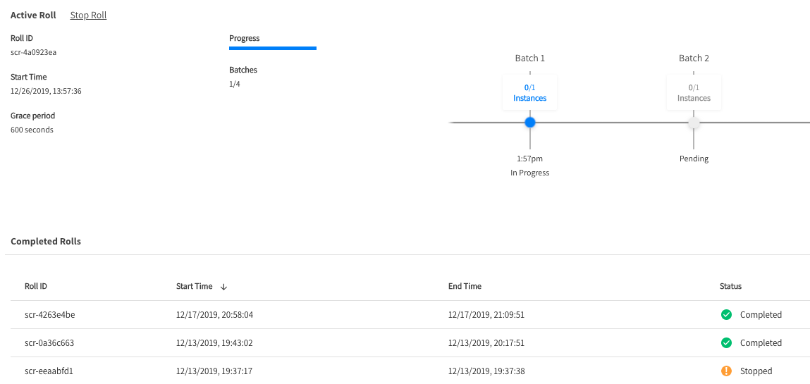 In the UI console, a specific batch may appear with a Pending state. This means that even though the roll process has started, that batch has not yet started to replace its nodes.