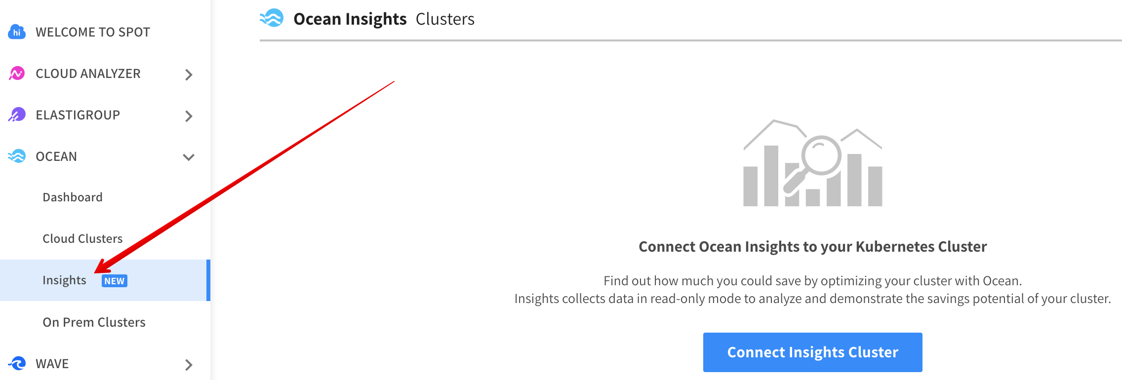 Go to Ocean in the Spot console and click Insights.